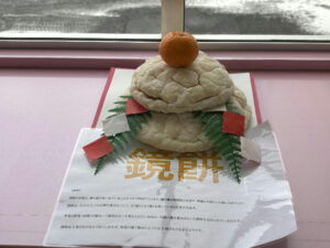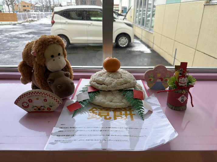 アカデミーの玄関もクリスマスからお正月バージョンに様変わりです。写真の真ん中にある鏡餅は、餅つきの時に園児の皆でついた餅です。少し平べったい鏡餅ですが、「アカデミーの子ども達が、幸せな1年を過ごせるように、そしてご家族の皆様にもその幸せを広げていけるように」という願いをのせたお供え物です。