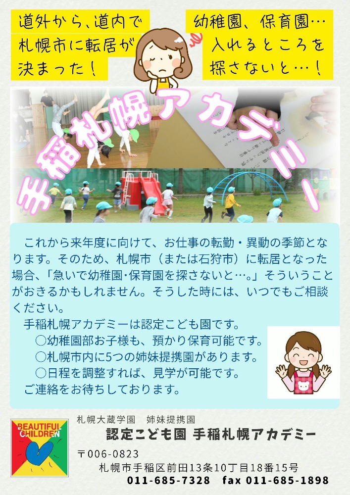 札幌市に転居予定の皆様に 2026年1月9日 お知らせ by アカデミー手稲札幌. お仕事の転勤・異動などで、来年度初めに、札幌市に転居される方がこれから増えてくるかと思います。 幼稚園・保育園探し → このチラシをご覧ください。 前の記事