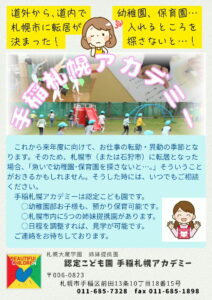 さて、令和8年度入園に向けて、アカデミーの見学を受け付けております。今後札幌方面に転居・転勤を予定されている方、まだ保育園や幼稚園が決まっていない方はご相談ください。